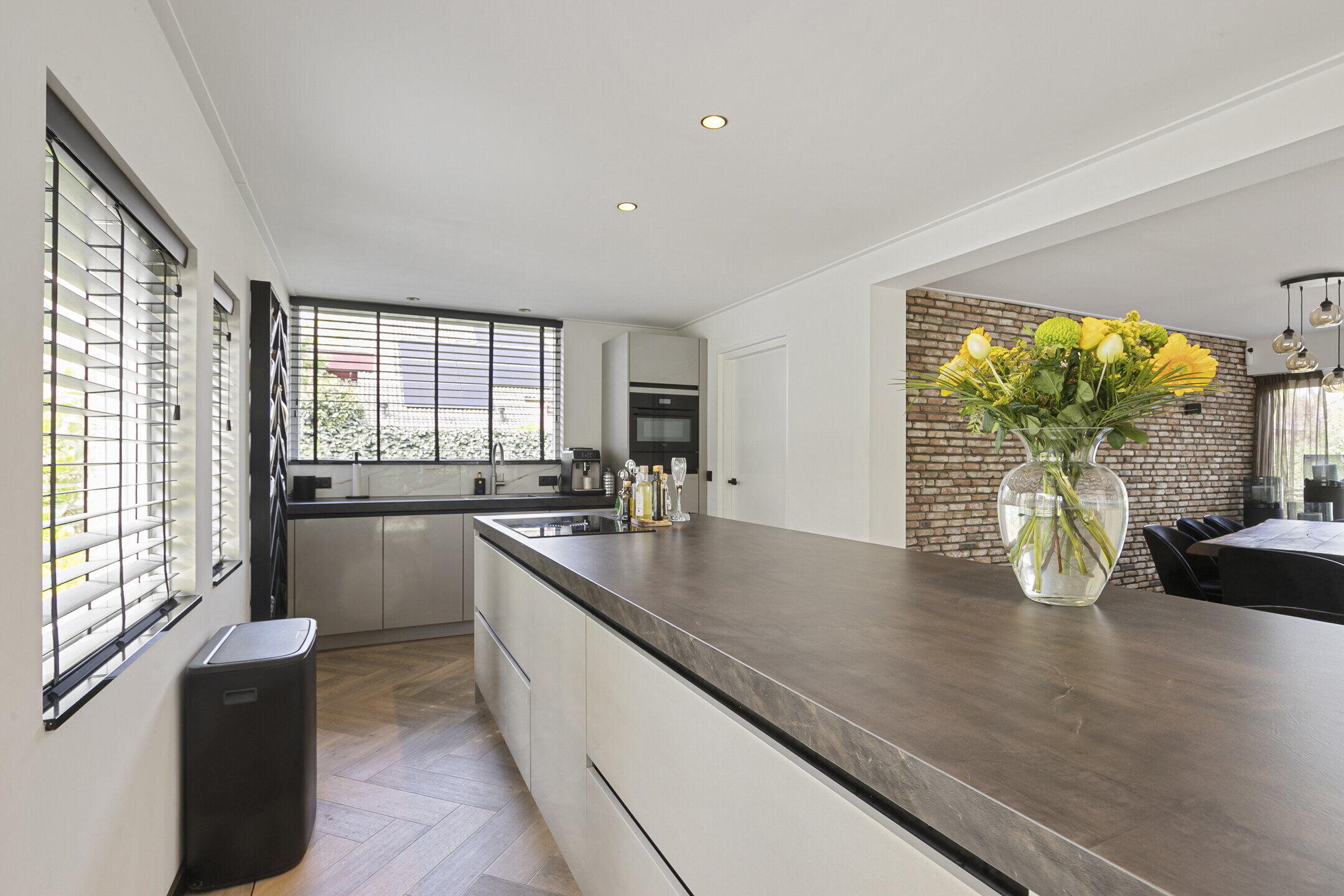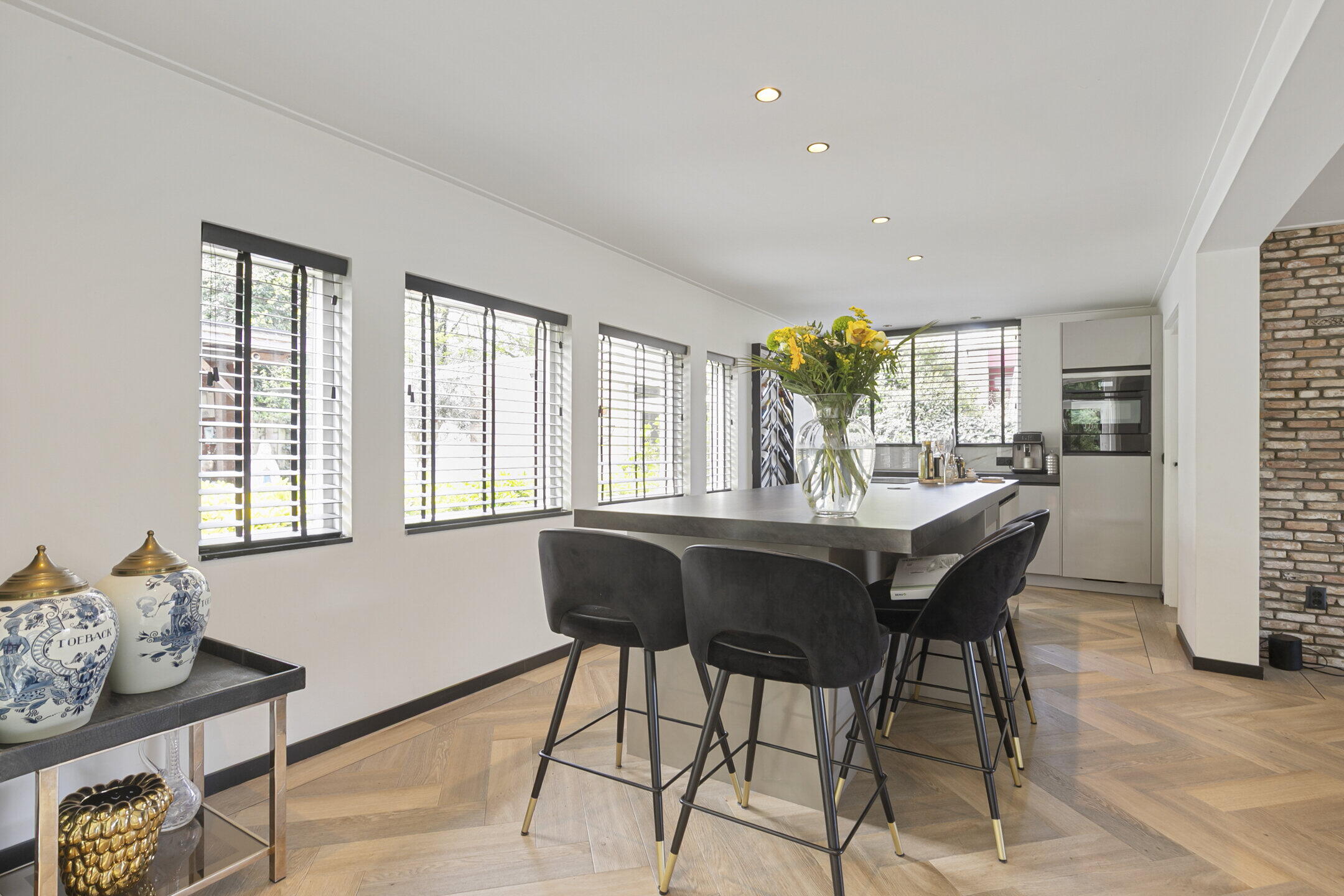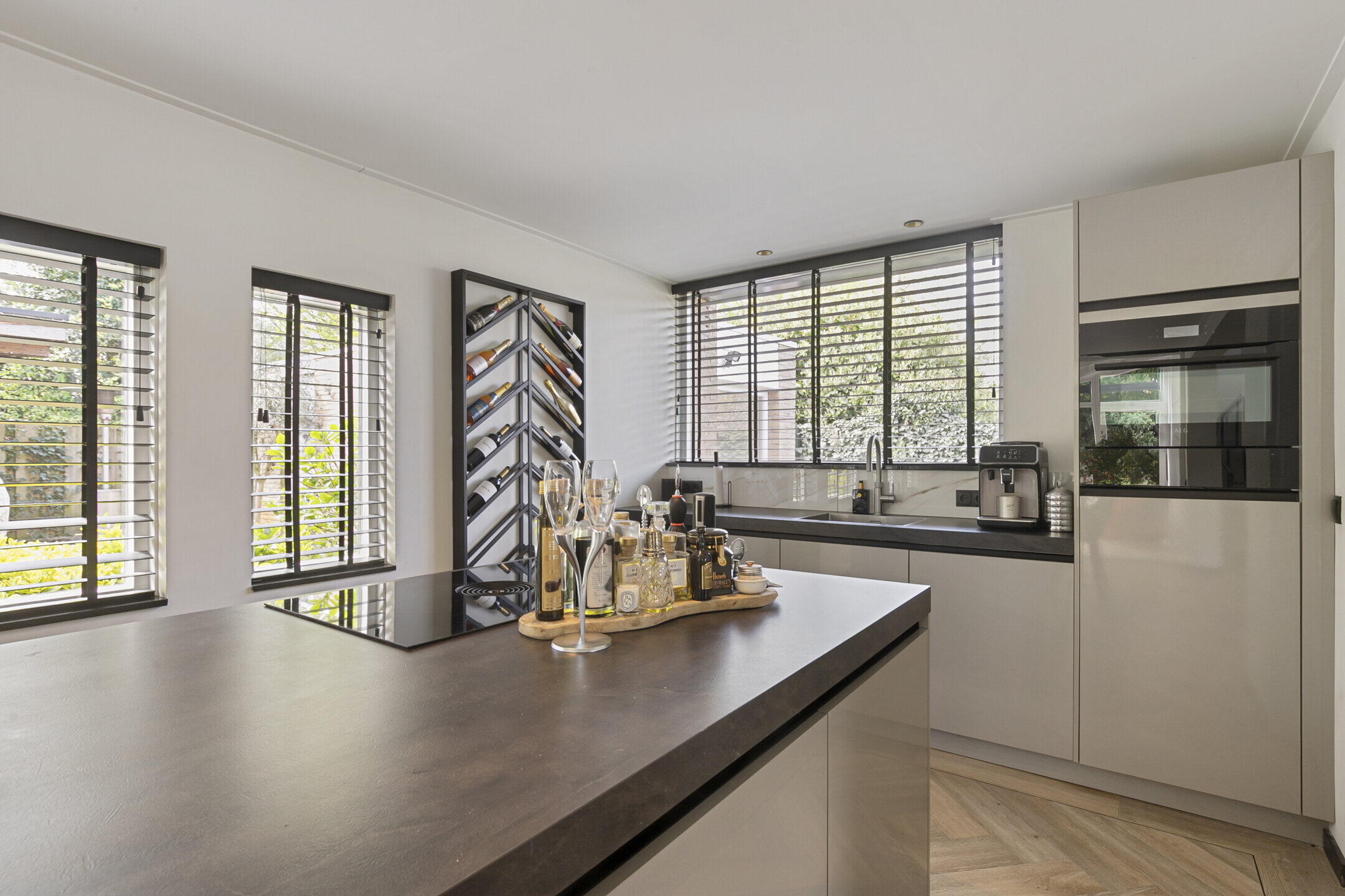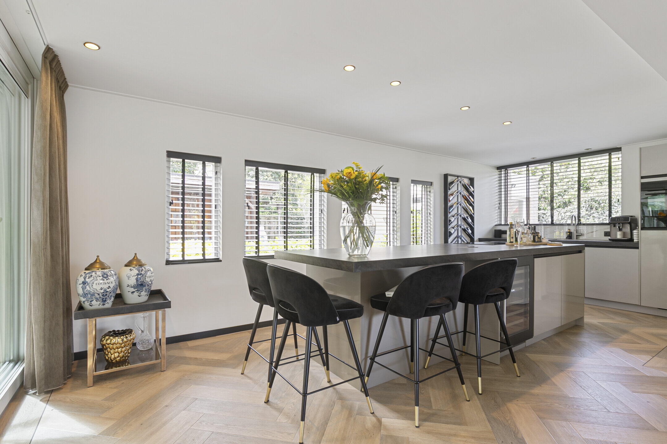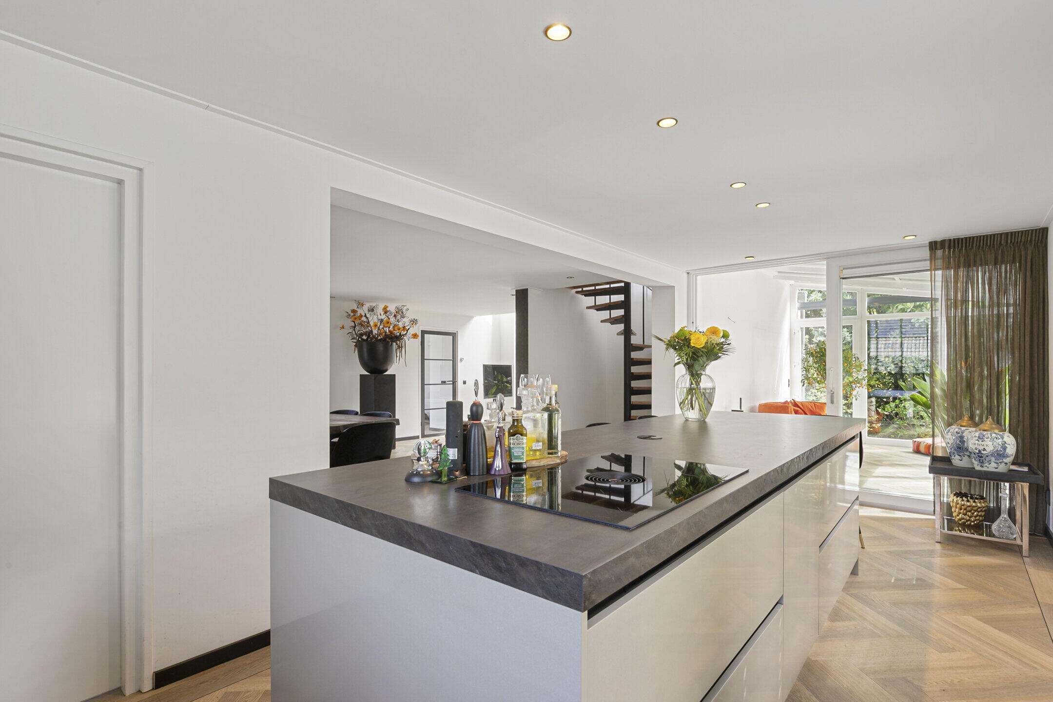 De begane grond heeft een knusse zithoek met een prettig lichtinval door o.a. het aanbrengen van 2 dakramen en de aanwezige gashaard. De ruime woonkeuken is uitgevoerd met een kookeiland voorzien van luxe inbouwapparatuur zoals een Bora inductiekookplaat met geïntegreerde afzuiging, een quooker, een serviesverwarmer, combimagnetron en een wijnkoeler. Er is een recht keukenblok met een inbouwkoelkast en een vaatwasser. Hiernaast is de praktische bijkeuken.