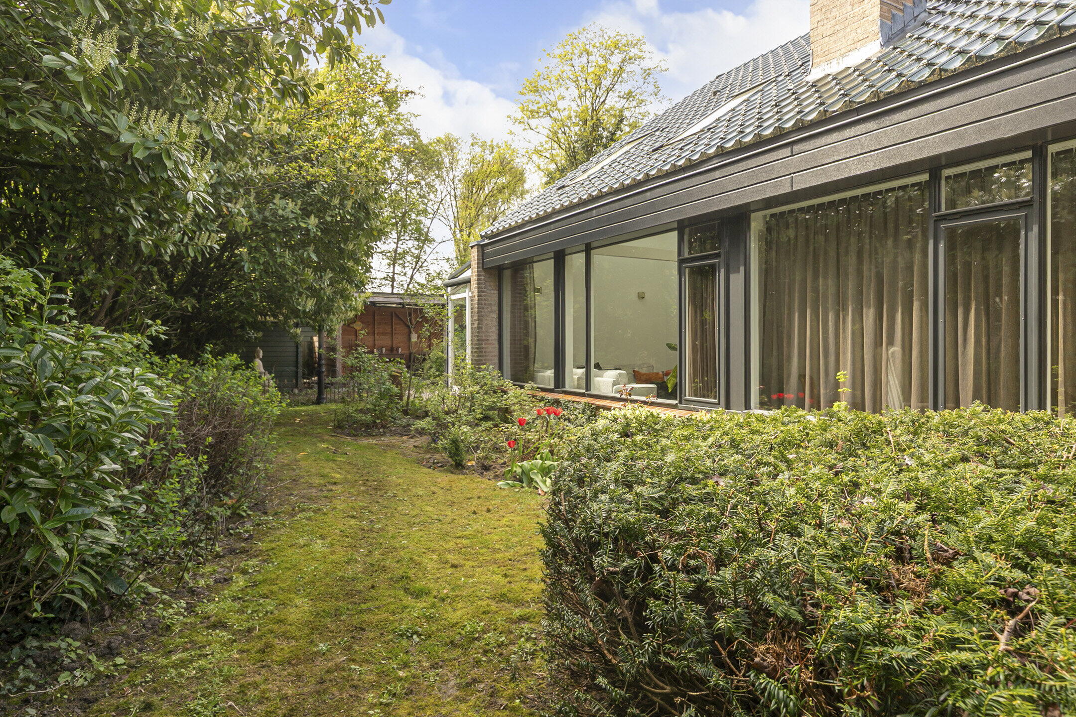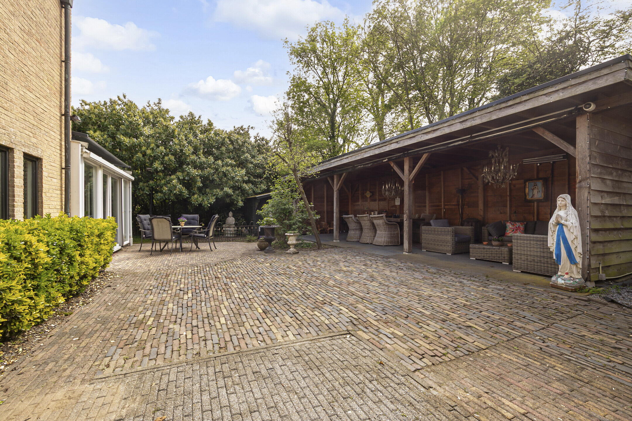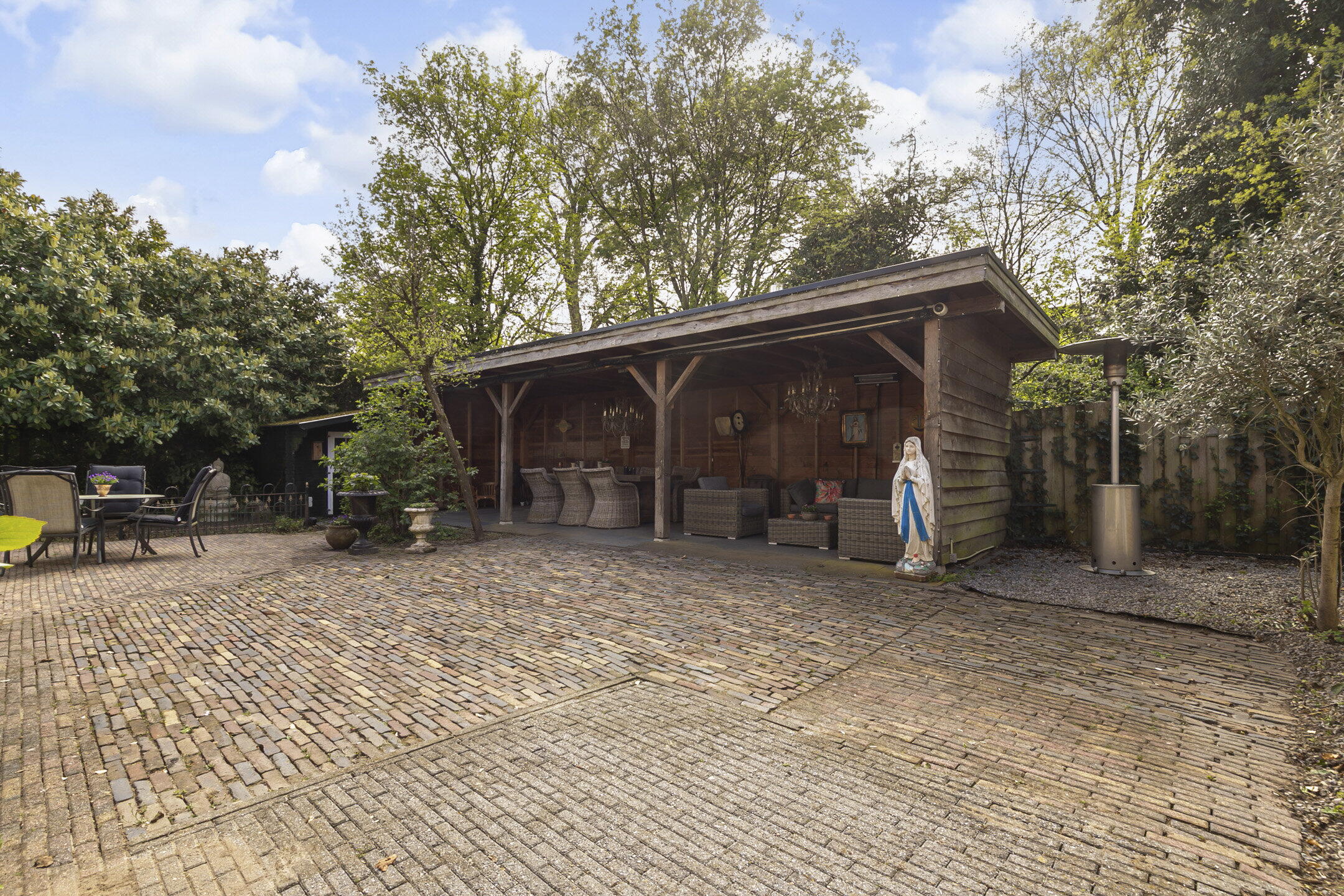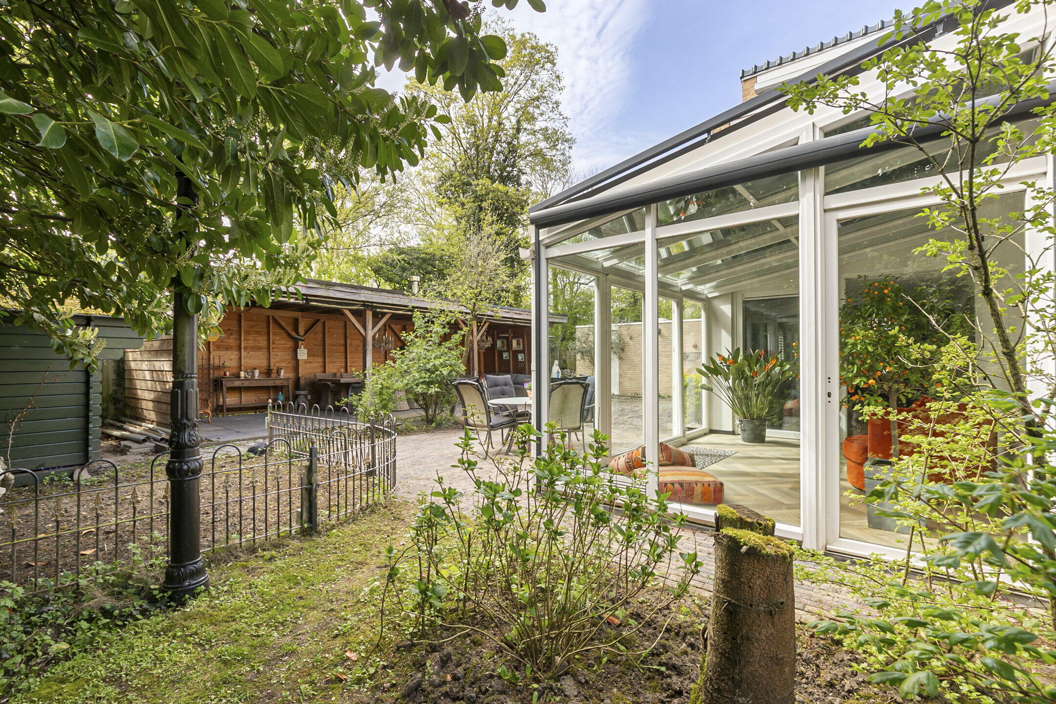 De weelderige tuin ligt rondom de woning en heeft meerdere plekken waar je heerlijk kunt genieten in de zon en van de rust. Er is volop privacy en onder de overkapping, die ruim 10 meter breed is, kun je een heerlijk zitten in de schaduw. Voor ieder wat wils!