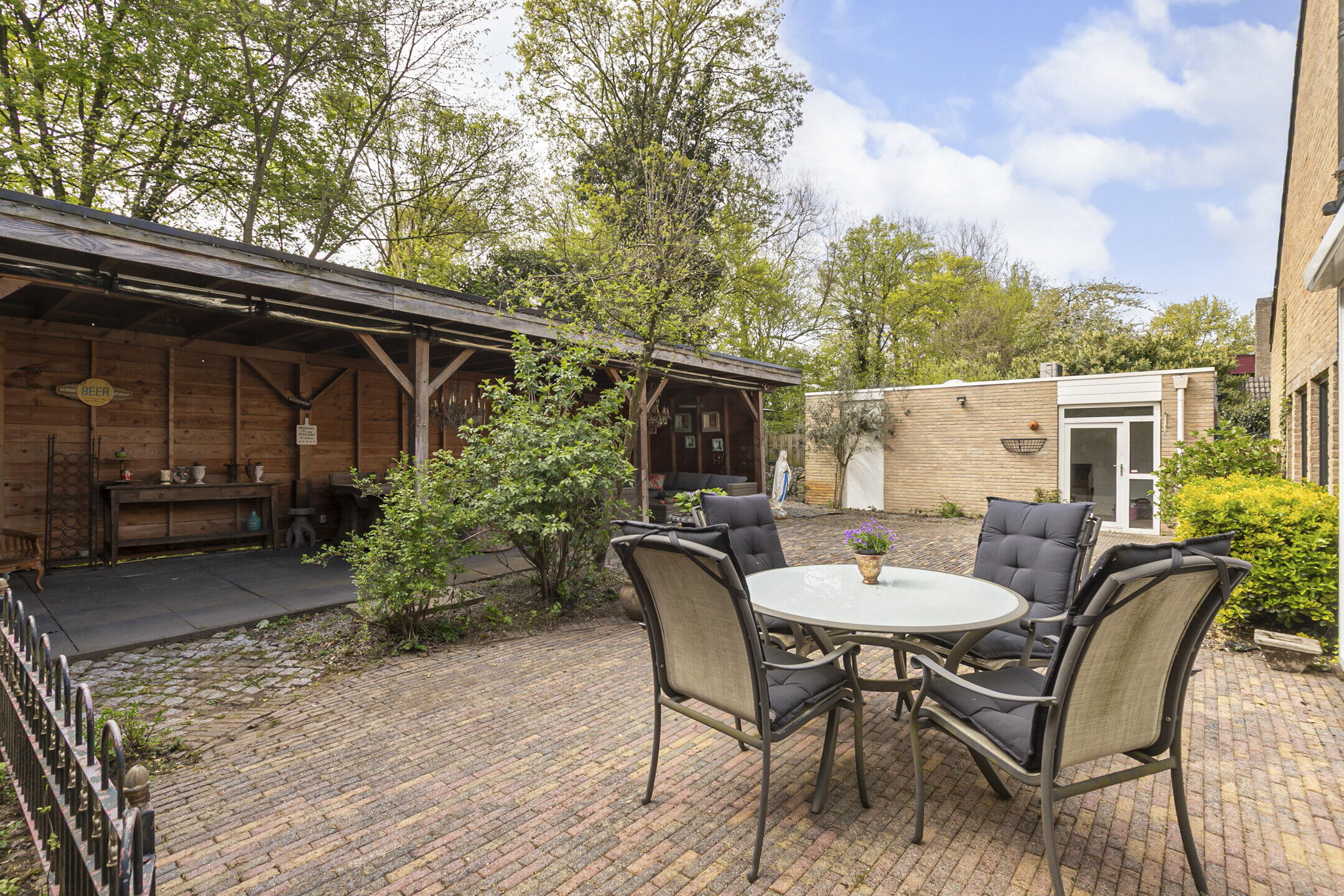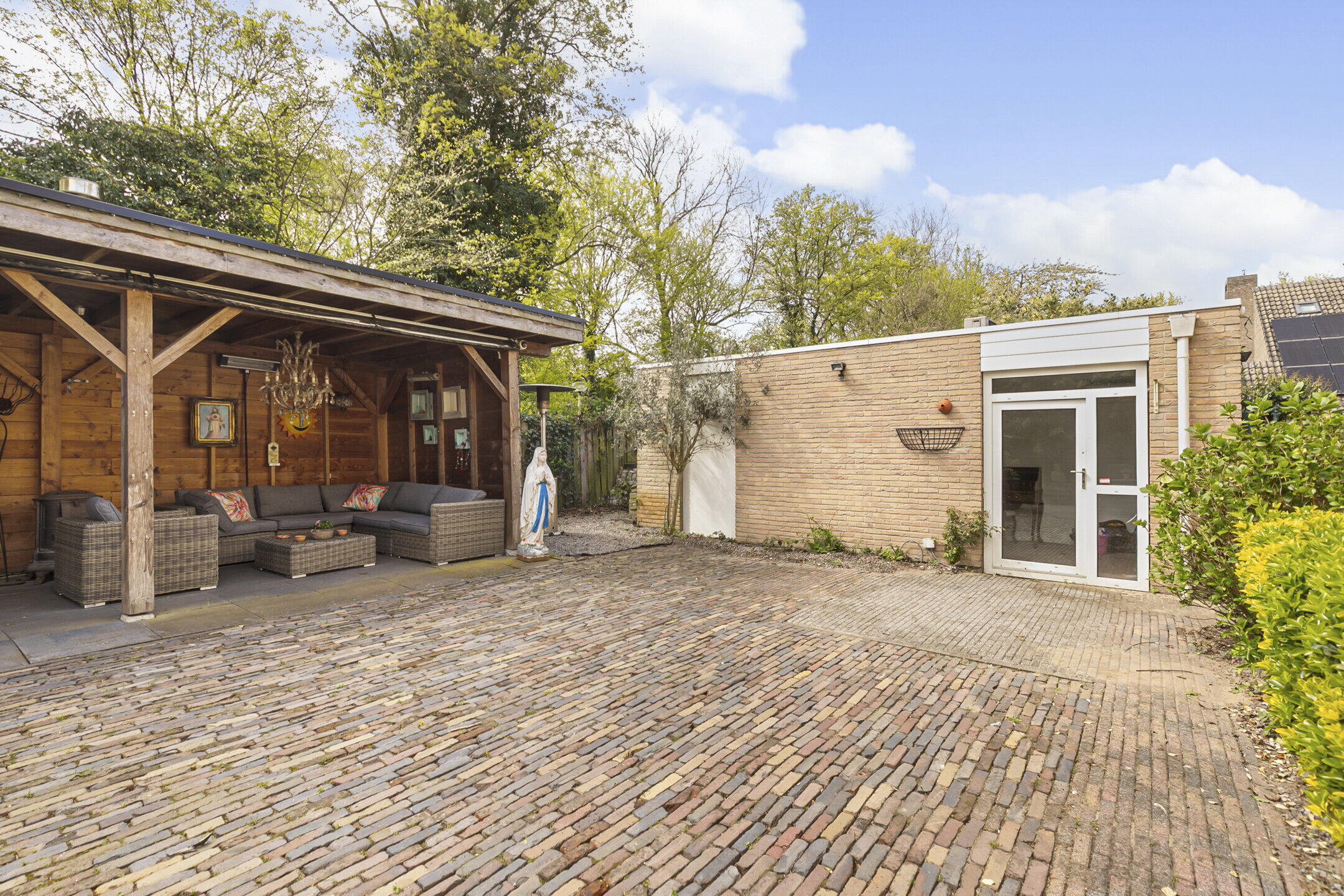 In de achtertuin vind je alle gewenste privacy en er is een royale overkapping waar je heerlijk kunt vertoeven met een kopje koffie, een gezellig wijnmoment met familie of de BBQ aansteken met vrienden. De voormalige garage is nu ingericht als een kleine studio voorzien van een toilet en douche. Hier is ook een airco aanwezig voor koeling en/of verwarming. Ideaal bijvoorbeeld voor de jong volwassene die nog geen eigen woonruimte heeft of als guesthouse. Aan de voorzijde is een brede oprit waar je meerdere auto’s kunt parkeren.