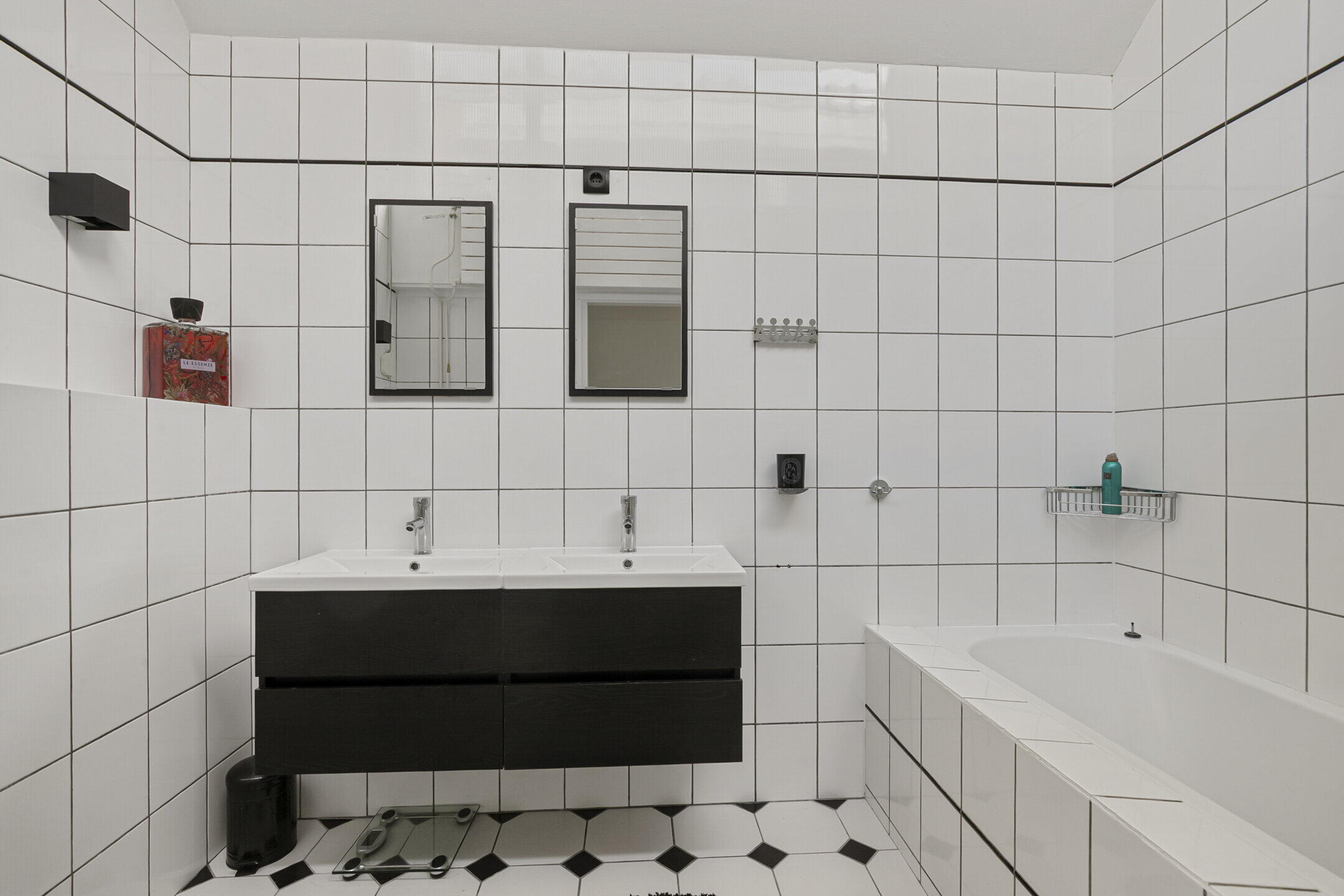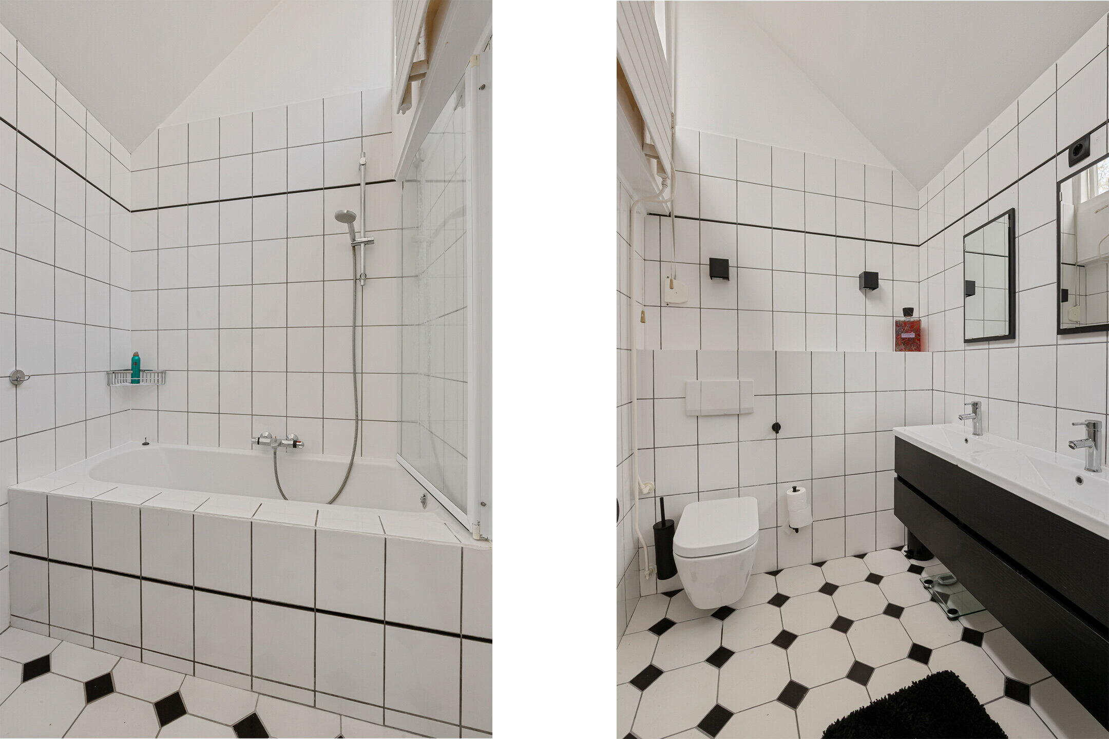 - Ligbad, toilet, dubbele wastafel, wastafelmeubel
